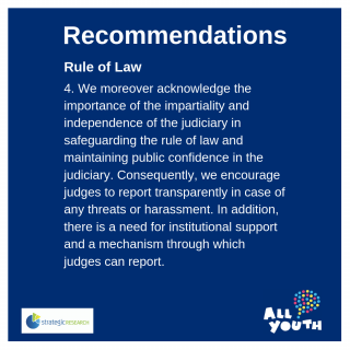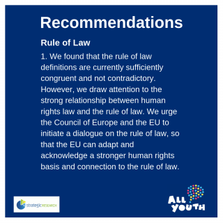 Suomen puheenjohtajuuskauden tavoitteena oli korostaa oikeusvaltion ja ihmisoikeuksien välistä yhteyttä. Tämän perusteella päätimme, että suositukset koskevat viittä eri teemaa, mutta niistä suullisesti esitetään vain oikeusvaltioon läheisesti kytkeytyvät teemat. Valinta tehtiin, jotta suositukset eivät rönsyile ja eriydy päivän muusta teemasta. Tavoitteena oli, että nuorten suositukset oikeusvaltiokehityksestä eivät jäisi sivuosaan vaan niillä olisi keskeinen päärooli konferenssipäivän ohjelmassa.