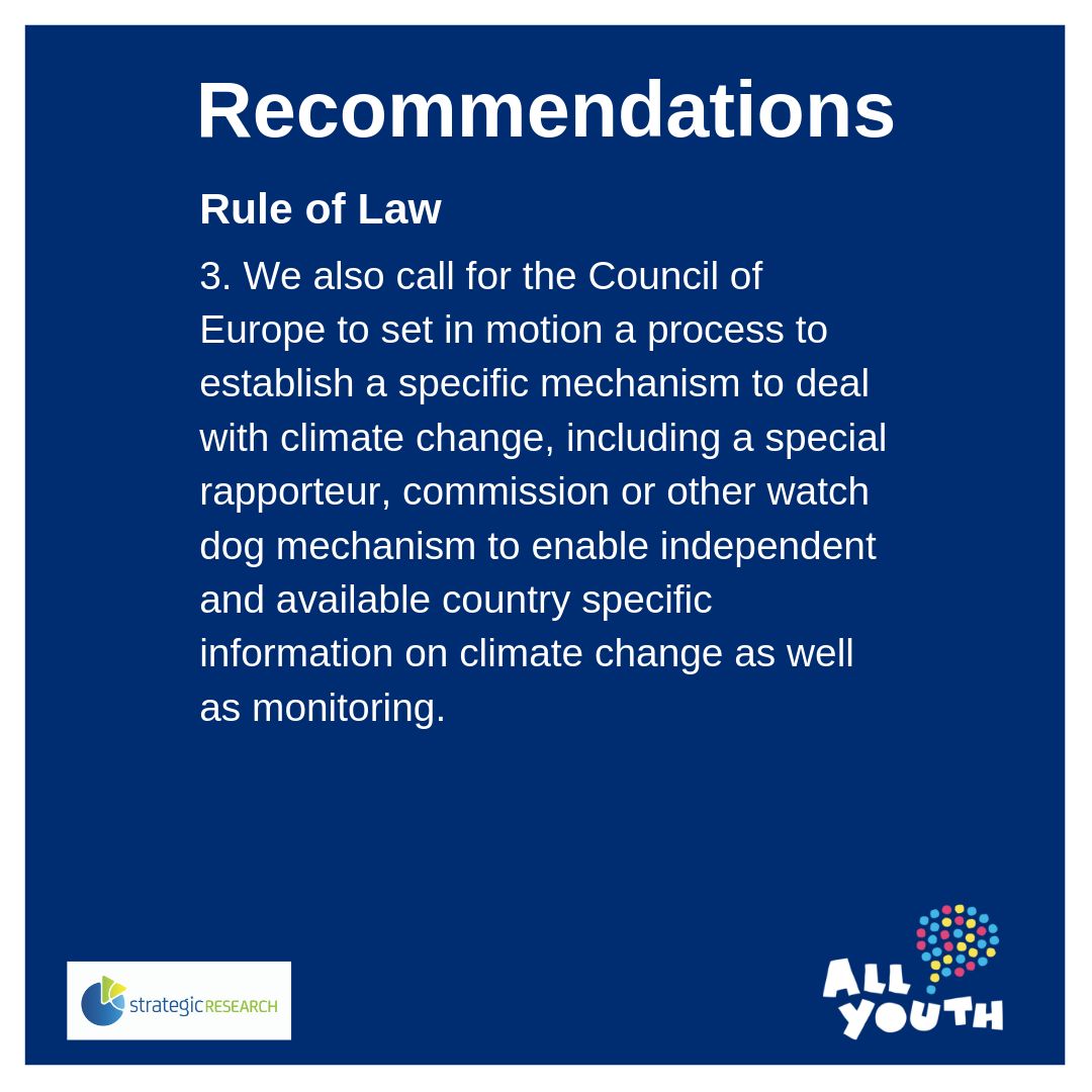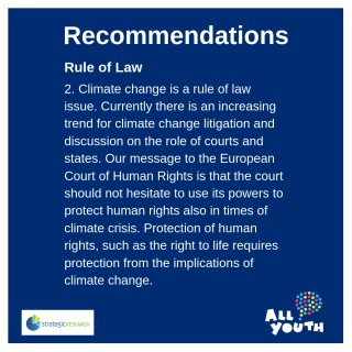 Nuoret kiinnittivät huomiota esimerkiksi siihen, että ilmastonmuutos uhkaa ihmisoikeuksia ja kytkeytyy oikeusvaltio-periaatteeseen ja siksi olisi keskeistä miettiä tuomioistuinten toimivaltaa ilmastoasioissa sekä tukea sitä. Nuoret toivoivat myös Euroopan neuvostolta erityisesti voimauttavia materiaaleja ja opettajayhteistyötä, jotta nuoret oppivat vaikuttamaan ja osallistumaan. Yhdenvertaisuusasioihin ja vihapuheeseen nuoret tarttuisivat koulutuksen avulla.