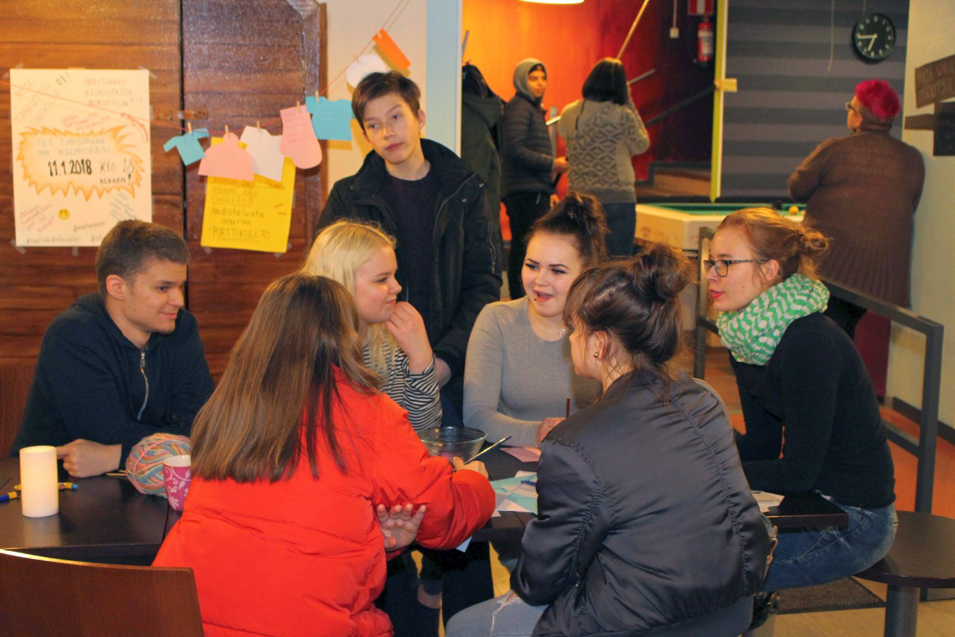 Salin pöydistä kuuluu innokasta puheensorinaa. Post it -lappuja lentelee, ajatuksia kirjaillaan ylös, ja välillä haetaan lisää kahvia ja pikkupurtavaa. Yläkoulu- ja lukioikäiset nuoret keskustelevat ilmastonmuutoksesta, ja pähkäilevät, miten se muuttaa elämää tulevaisuudessa. Loppuuko maailmasta juomakelpoinen vesi? Tuleeko Suomesta viinintuottajamaa? Siirrytäänkö rahataloudesta vaihtotalouteen? Keskustelu jatkuu pitkälle iltaan. Tänään läksyt tehdään kotona myöhään, mutta se ei näytä haittaavan nuoria. Illan päätteeksi nuoret esittävät toiveen: ”Lisää tällaisia keskusteluja!”