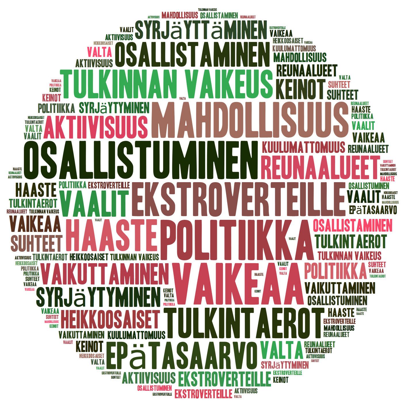 Sana-assosiaatiopelin viimeinen sana oli oikeastaan kolme sanaa, jotka olivat samalla palstalle osallistuville annettu tehtävänanto. Kokonaisuudessa äänen kuuluminen yhteiskunnassa tiivistyy tehtävänannon haasteellisuus. Tähän sanakolmikkoon liittyi niin vaikuttaminen kuin osallistuminenkin, ja samalla sen toteutuminen nähtiin mahdollisuutena mutta vaikeana ja jopa epätasa-arvoistavana.