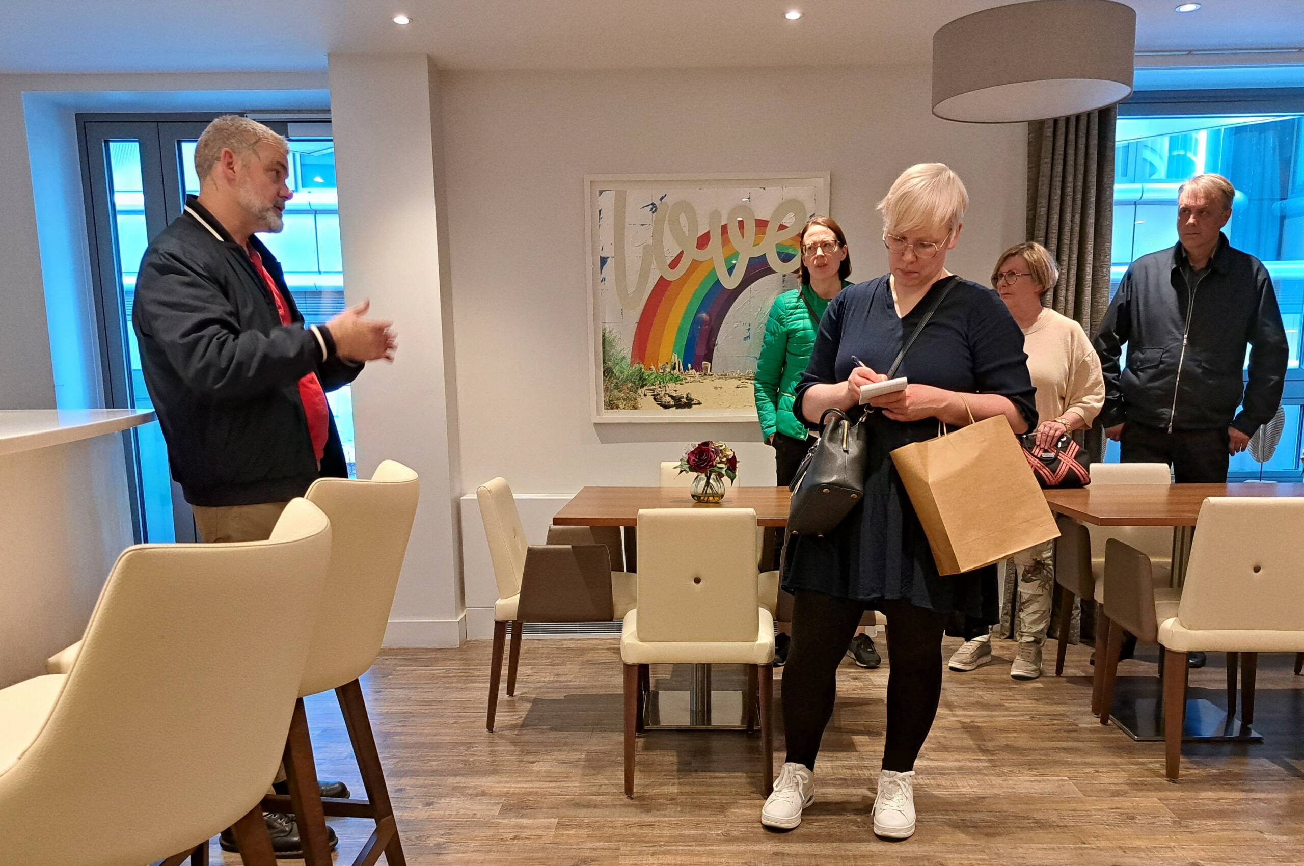 Saimme lämpimän vastaanoton Tonicin Bankhouse yhteisöön – suomeksikin. Oli ilahduttava yllätys, että siellä asui suomalainen, joka lupautui näyttämään meille omaa asuntoaan ja kertomaan asumisesta Yhdistyneiden kuningaskuntien ensimmäisessä LGBT+ -senioriyhteisössä. Tapasimme myös muita asukkaita talon baaritilassa, jossa voi viettää aikaa yhdessä. Tilan vieressä oli toinen talon kattopuutarhoista, joka oli tarkoitettu oleskeluun. Tämän lisäksi talon toisessa kattopuutarhassa asukkaat pääsivät myös kasvattamaan kukkia ja vihanneksia. Tonicilla on Bankhousessa 19 osaomistusasuntoa, mutta he aikovat myös ostaa vuokra-asuntoja käyttöönsä. Näin asuminen heillä olisi saavutettavampaa kaikille asukkaille, kun asuntoa ei tarvitse ostaa itselle.