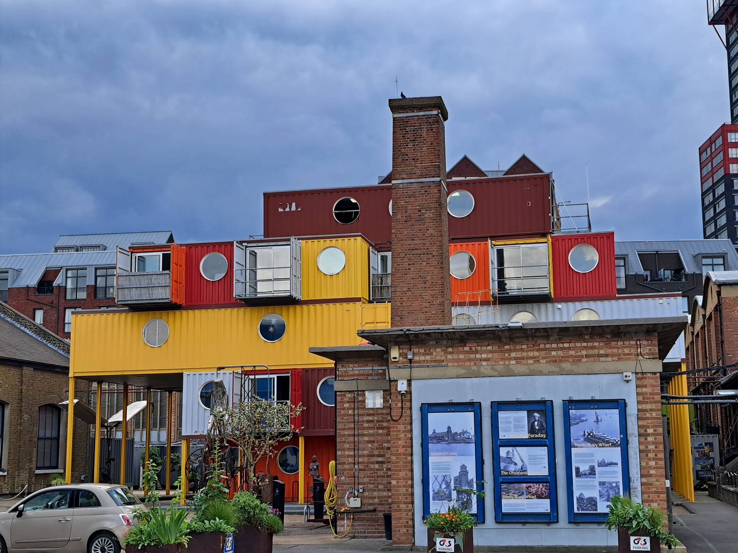 Opintomatkan viimeisenä kohteena olivat Container Cityn teräsmoduulit, joista on rakennettu erilaisia työtiloja Trinity Buoy Wharfille. Taiteilijoiden oli aluksi mahdollista myös asua konteissa, mutta nykyään asuminen on jäänyt pois Container Citystä. 2000-luvun alussa valmistuneet kontit näyttivät olevan vieläkin hyvässä kunnossa ja käytössä.