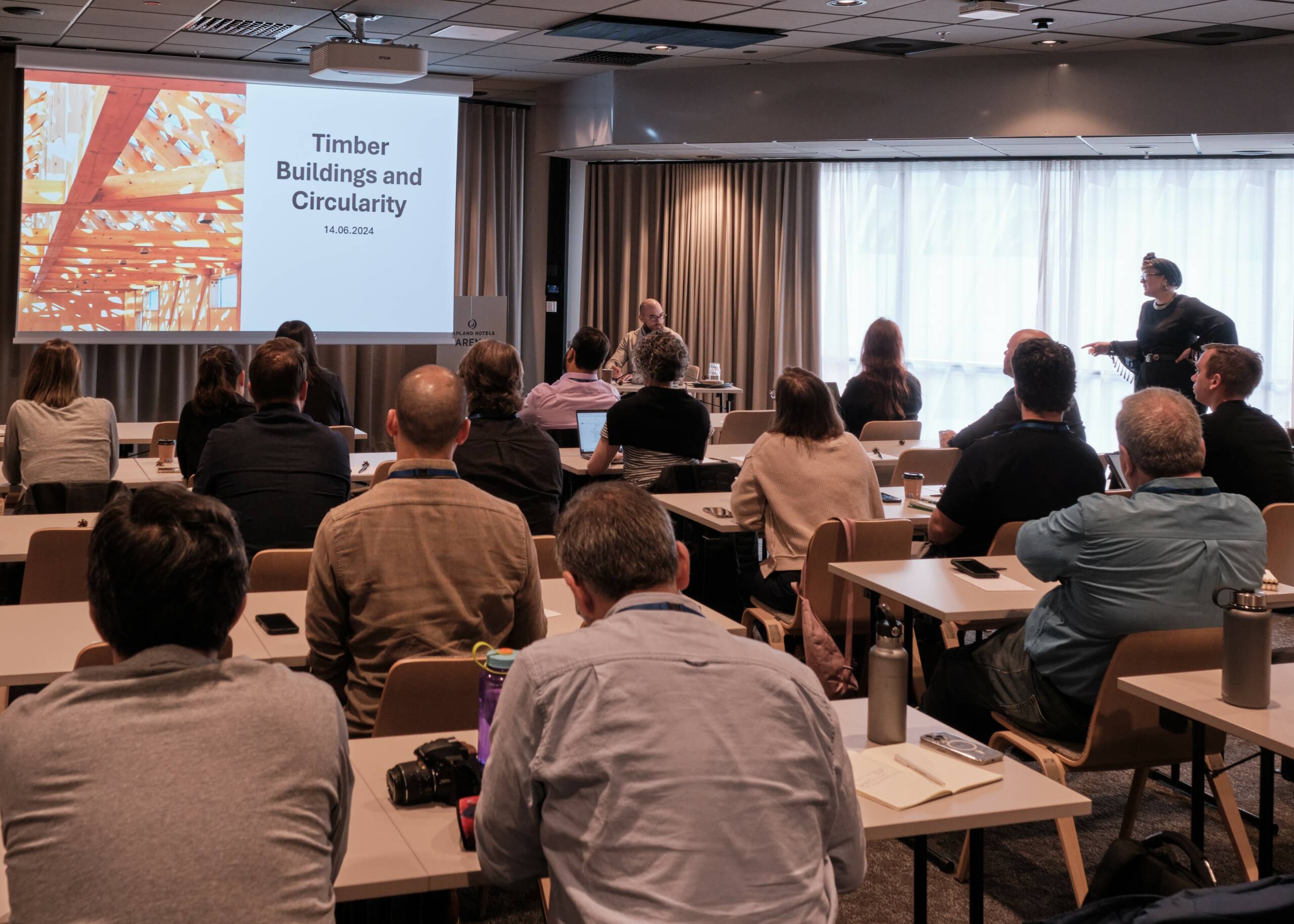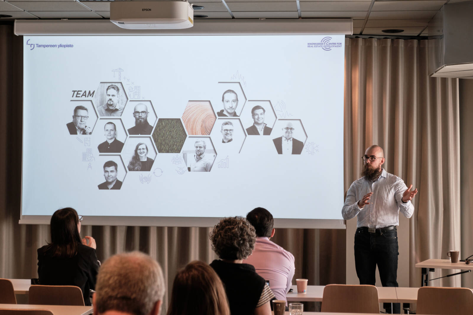 Yli 30 rakentamisesta kiinnostunutta delegaation jäsentä kokoontui Tampereen Lapland Hotelsin Arenalle. Aamun aiheena oli puurakentamisen ja kiertotalouden nykytilanne, edistäminen ja tutkimus Tampereella. Pekka Salmi avasi tilaisuuden esittelemällä puurakentamisen tilannetta Tampereella. Seuraavaksi Pirkko Eteläaho Business Tampereelta antoi katsauksen paikallisen toimijaverkoston koordinointiin.
