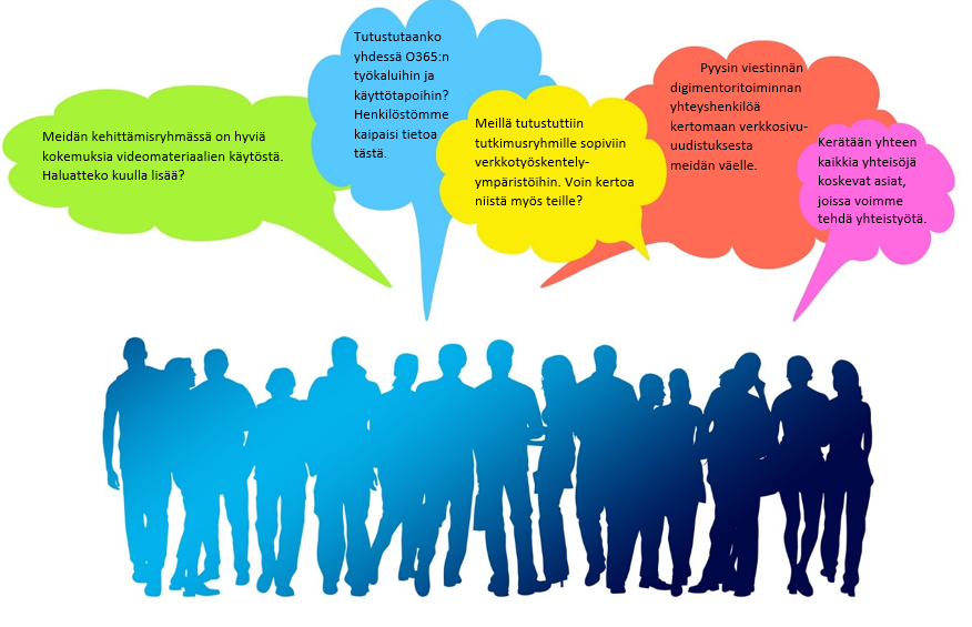 Koko korkeakouluyhteisölle digimentoriverkosto näyttäytyy avointen verkkosivujen, viestinnän ja toiminnan kautta. Tapaamisista raportoidaan koko yhteisölle ajankohtaista-palstan kautta. Vinkkipankissa jaetaan parhaimmat ideat ja käytännöt kaikkien hyödynnettäviksi. Yhteystiedot sivulta löytyy listaus oman tiedekunnan tai yksikön digimentoreista.