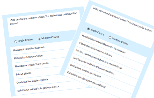 Tapaamisessa kävi ilmi monta tapaa, miten digimentorit ovat omissa yhteisöissään tukeneet etäopetukseen ja -työskentelyyn siirtymistä. Eniten digimentorit kertoivat tehneensä tiedotusta ja ohjeistuksia sekä selvittäneet asioita kollegoiden puolesta ja neuvoneet heitä. Moni kertoi opetelleensa itse myös uusia asioita ja ohjelmia ja pitäneensä koulutuksia ja infoja yhteisössään. Poikkeustilanteen alkuviikkoina eniten oli kyselty verkko-opetuksesta yleensä ja reaaliaikaisesta videotapaamisista. Yhdessä todettiin, että kun alkuun on päästy, niin kevään myötä kysymykset osaamisen osoittamisen muodoista ja tenttimisestä nousevat taatusti enemmän esille.