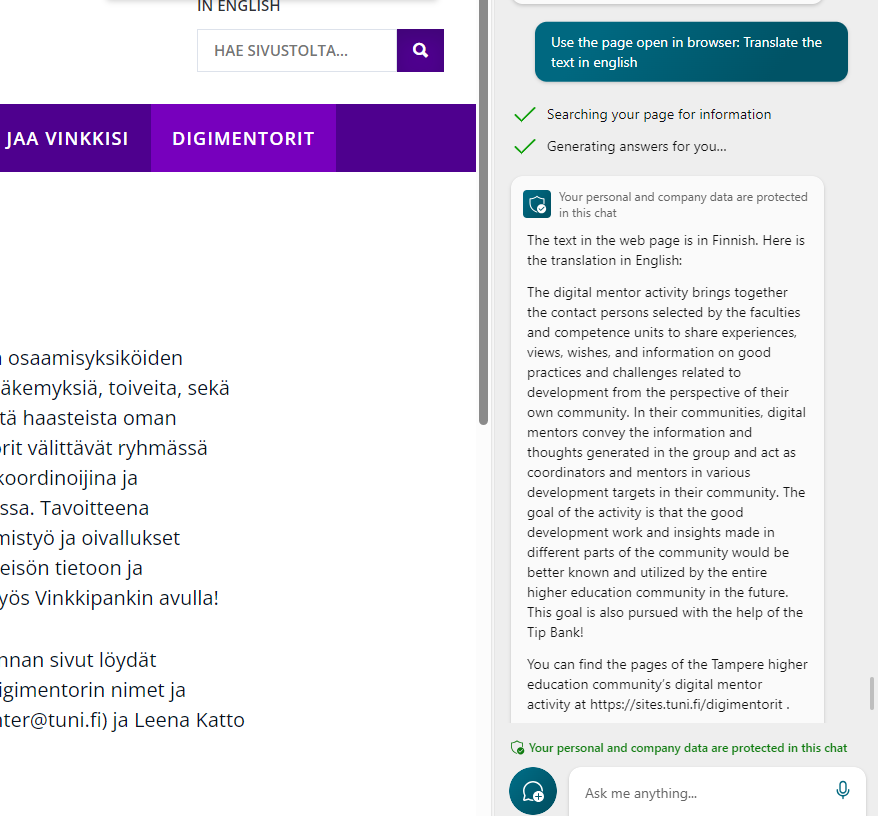 By utilizing translation features in support of teaching preparation, you can quickly produce different language versions of the text as well as summaries and descriptions in another language. You can also use AI as a language checker to improve your text. This tip introduces a few examples, which tell what kind of prompts or requests have been asked from the AI application. The examples have utilized the Copilot (former Bing chat Enterprise) AI application. Read more about the program from the intranet.