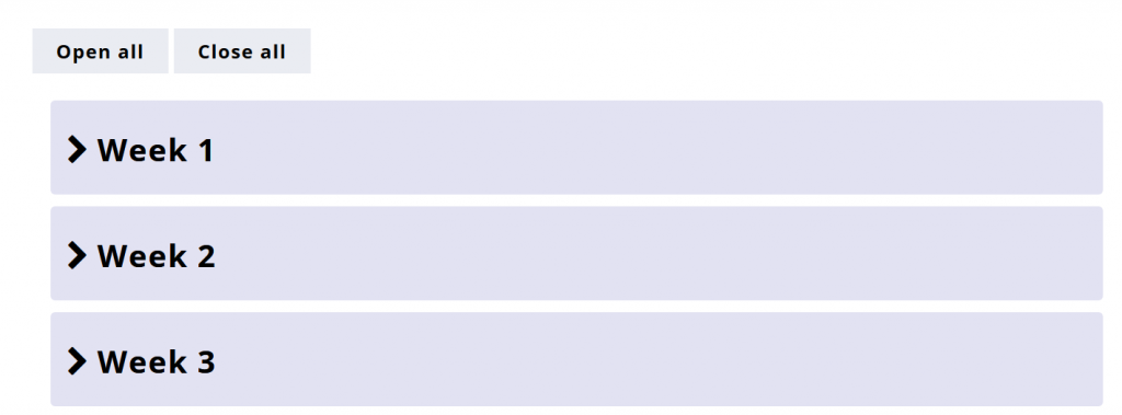In the Collapsed Topics format, students can click on the title of a topic to show or hide content. Clicking on a title will only reveal the content of that particular topic block. In the image on the left, all the topics are collapsed.