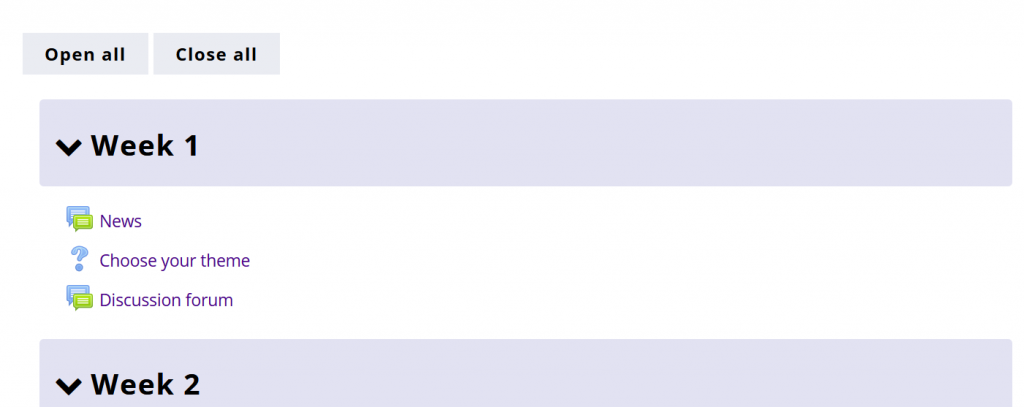 The Collapsed topics format creates a collapsible menu system which groups items by topic or week as desired. By default, the active topic or week is displayed, and content sections that are not needed are hidden. When a user returns to the course page, Moodle will remember which sections were displayed and which were hidden during his or her previous session.