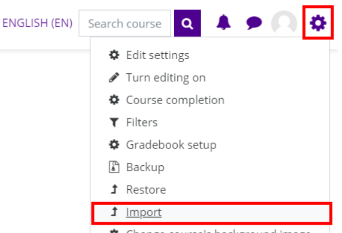 Sign in to TUNI Moodle and go to your new blank course page. Click Settings next to your profile picture. The Setting menu includes the Import function, which enables you to copy your old course page to the new one.
