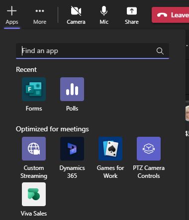 1. If you don’t see Polls at the top of the meeting room, select Add an app behind the three dots at the top of the Teams meeting room.