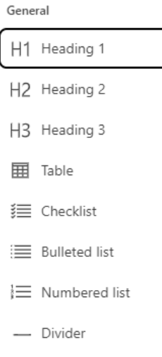 To an empty base or the template you have chosen, you can add components, i.e., functional elements and text fields, by typing the / symbol in the text field. This opens a menu.