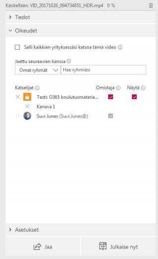 When a student navigates to the group (and channel) page and uploads a video, only the group members will be able to view the video by default. However, when uploading a video, it is always best to check the settings in the Permissions section to ensure the video is not accidentally published to the entire organisation. The checkbox Allow everyone in your company to view this video must be unselected. (Here “Salli kaikkien yrityksessäsi katsoa tämä video”)
