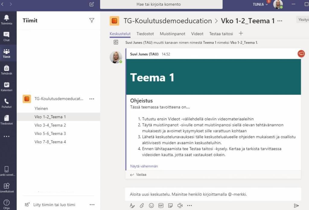 The teacher requests a collaborative class space called Education via the TUNI Groups website. After the space is ready, the teacher adds 20 students to the team.