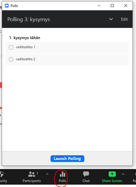 After you start the scheduled Zoom meeting that has polling enabled, click Polls in the meeting controls. Select the poll you want to launch by clicking Launch Polling.