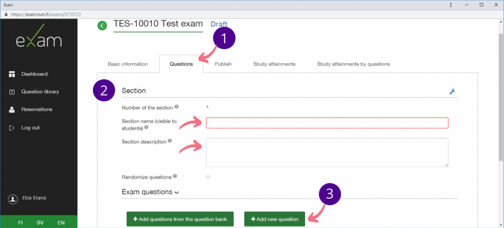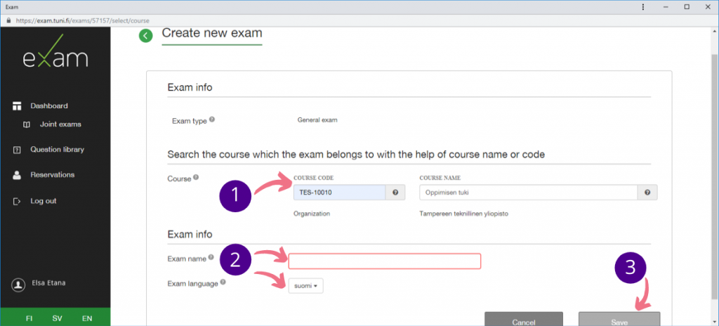 - Set exam name (you do not need to repeat the course code in the exam name) and choose language