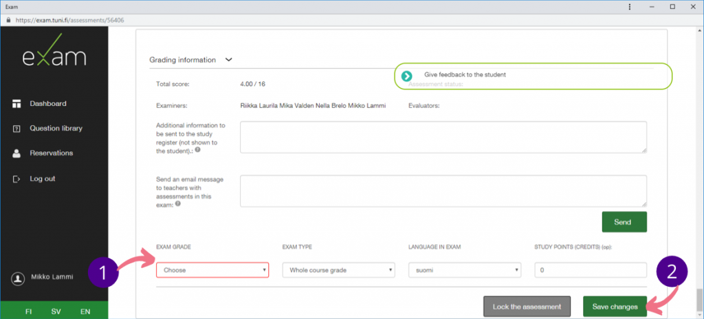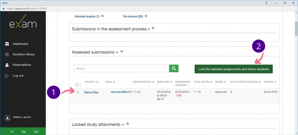 - Press Lock the selected submissions and inform the student -button. EXAM will send an automatic email to the student containing link to the assessment and feedback