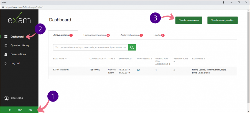 Log in to TUNI EXAM with your TUNI username at exam.tuni.fi. No separate access rights need to be requested. New staff users are automatically given both student and examiner roles upon their first login. If you have problems logging in, please refer to the following guide: Support for login problems.