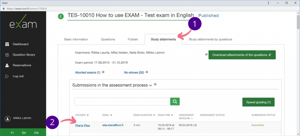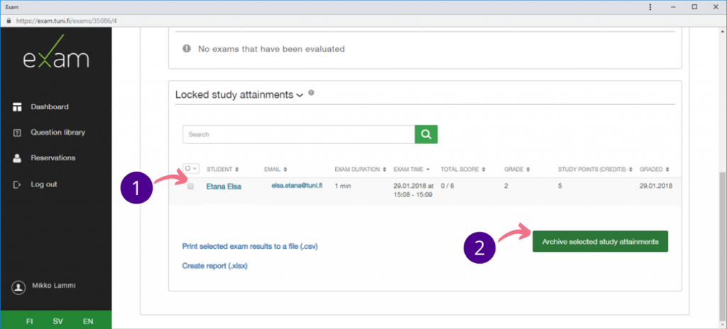 Entering an attainment for an implementation, like electronic examination, is made manually in Sisu. Instructions for this can be found on Sisu-wiki. Do not archieve the attainments in TUNI EXAM before saving attainments to Sisu.