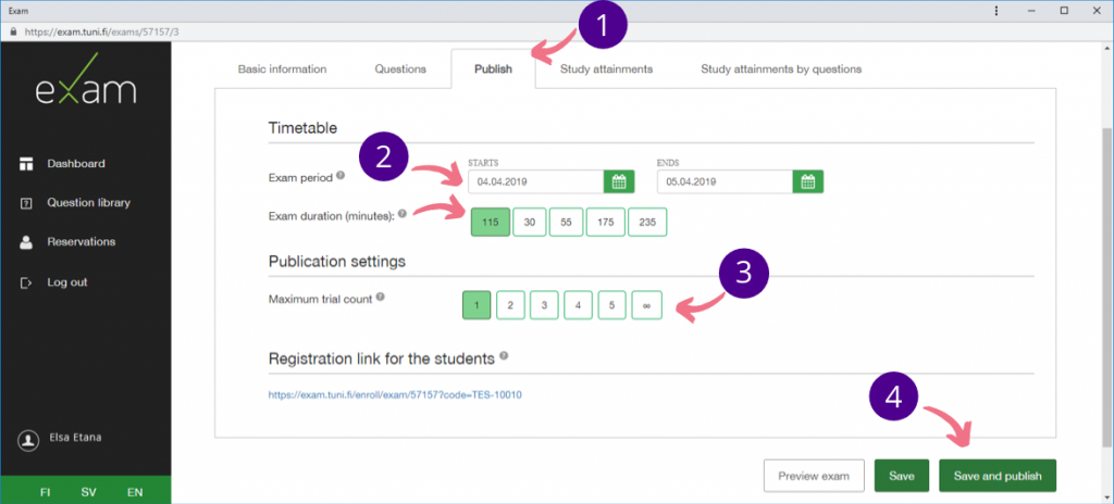 - Select exam period, when the exam can be taken. Also, set the exam duration.