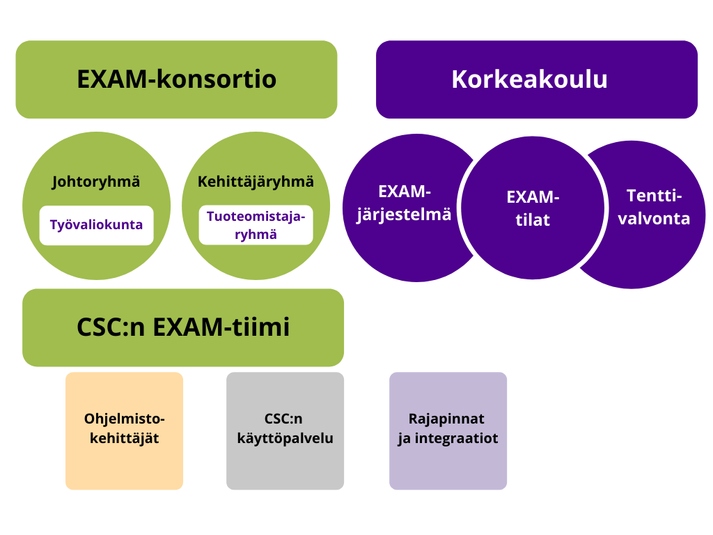 Konsortion toiminnasta vastaa konsortion johtoryhmä, joka muun muassa hyväksyy konsortion toimintasuunnitelman ja talousarvion sekä ohjaa EXAM-järjestelmän kehitystä. EXAM-järjestelmän kehitystarpeita taas tunnistaa, määrittelee ja priorisoi kehittäjäryhmä. Kehittäjäryhmä seuraa ja arvioi EXAMin käyttöä ja toimivuutta sekä huolehtii järjestelmätestauksesta. Jokaisella korkeakoululla on oma edustajansa sekä konsortion johtoryhmässä että kehittäjäryhmässä.