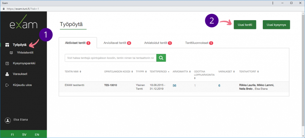 - Kirjautumisen jälkeen siirry Työpöytä-näkymään, joka on omien tenttien yhteenvetosivu.