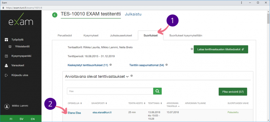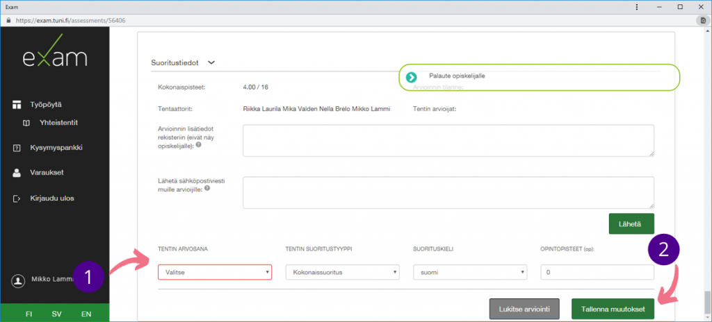 Arvioi (pisteytä) tenttivastaukset. Voit antaa myös sanallista palautetta.