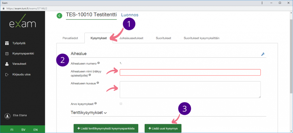 - Katso tarkemmat ohjeet eri kysymystyypeistä ja kysymyspankista.