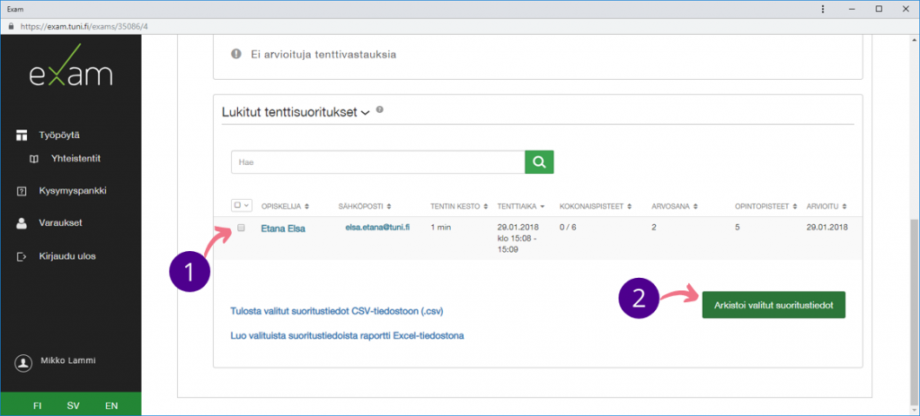 Kun olet lukinnut arvioidut tenttisuoritukset EXAMissa, kirjaa opiskelijoiden arviointitiedot opintotietojärjestelmään. Huom. Älä arkistoi tenttisuorituksia EXAMissa ennen kuin olet kirjannut arviointitiedot. Halutessasi saat ladattua EXAMista arviointitiedot, jotka voit tallentaa tietokoneellesi CSV- tai Excel-tiedostona.