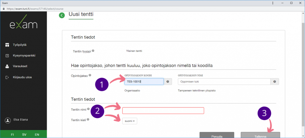 - Anna tentille nimi (opintojakson koodia ei tarvitse toistaa tentin nimessä) ja valitse tentin kieli
