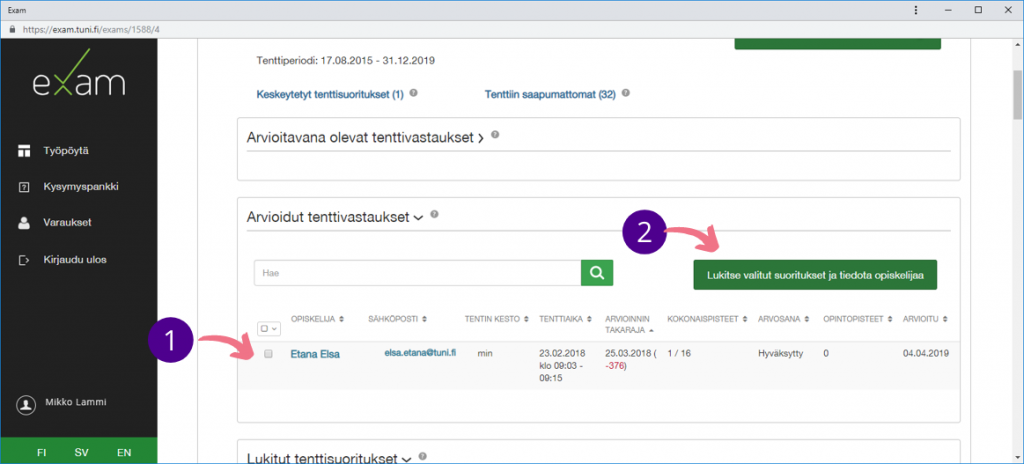 - Lukitse valitut suoritukset ja tiedota opiskelijaa. EXAMista lähtee automaattinen sähköposti opiskelijalle, jossa on linkki EXAMin arviointiin ja palautteeseen