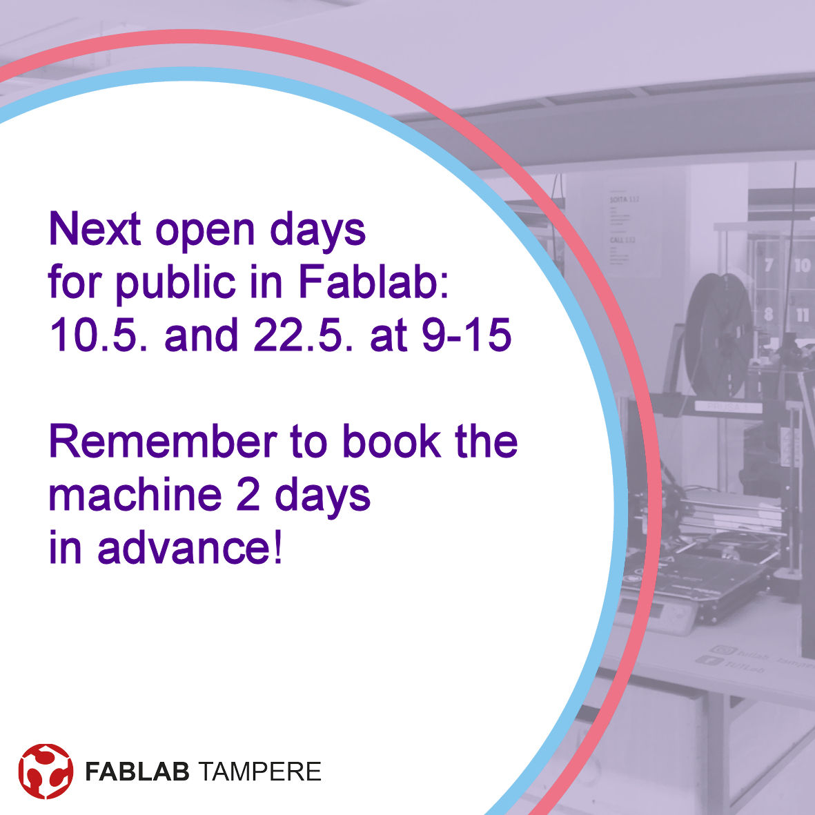 On May Fablab has two Open days for public: 10.5. and 22.5. at 9-15.