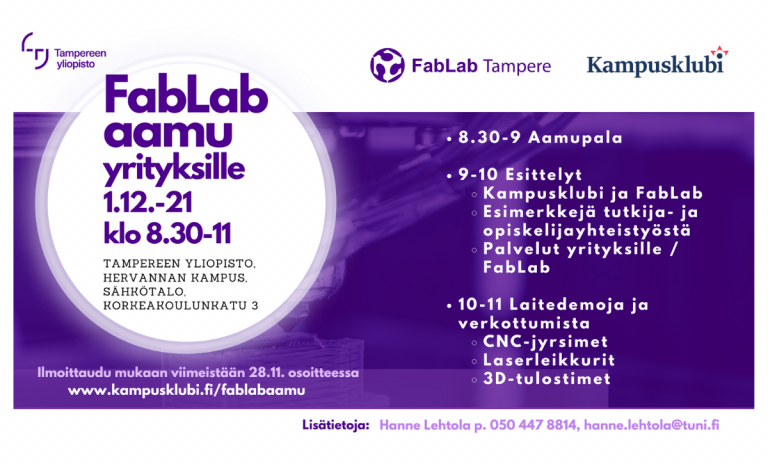 FabLab Tampere ja Kampusklubi järjestävät yrityksille FabLab-aamun 1.12.2021 klo 8.30 – 11 4.11.2021 Tapahtumat Yleinen