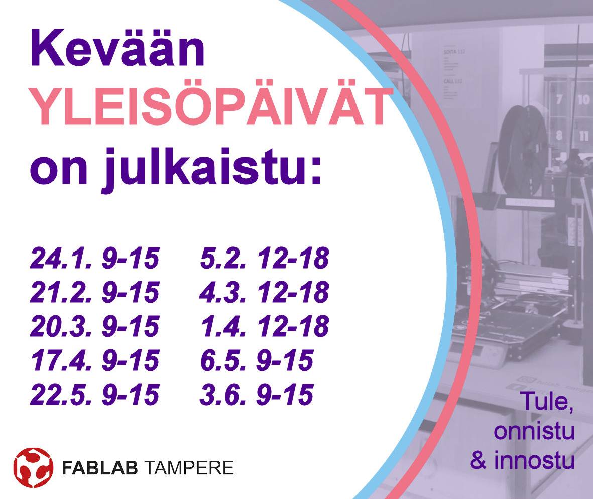 Varaa laite yleisöpäiville osoitteesta fablabtampere@tuni.fi viimeistään kaksi työpäivää ennen yleisöpäivää. Laitteet vapautuvat sisäisen varausjärjestelmän käyttöön tämän jälkeen.