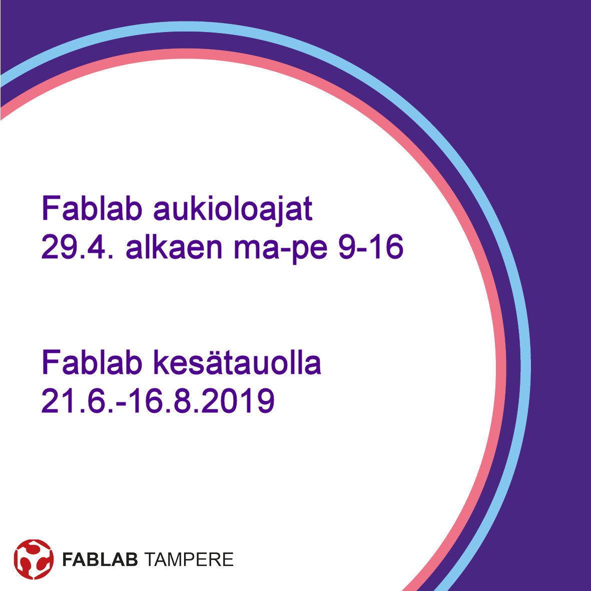 Fablabin kesäaukioloajat jatkuvat juhannusviikolle. Fablab on auki torstaina juhannusaaton aattona klo 9-14. Tämän jälkeen Fablab menee kesätauolle ja avaa ovensa jälleen ma 19.8.2019.