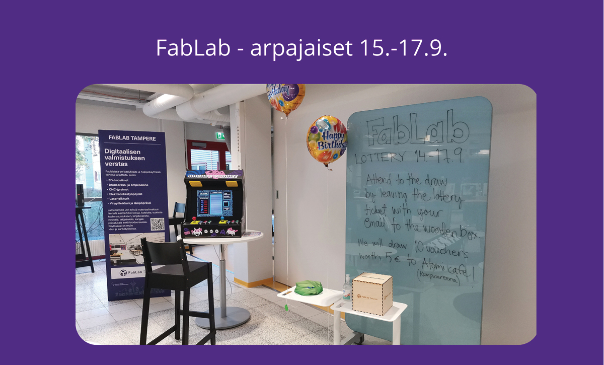 Samalla voit osallistua FabLab-arpajaisiin, 15.-17.9. välisenä aikana jättämällä yhteystietosi arvontalaatikkoon.