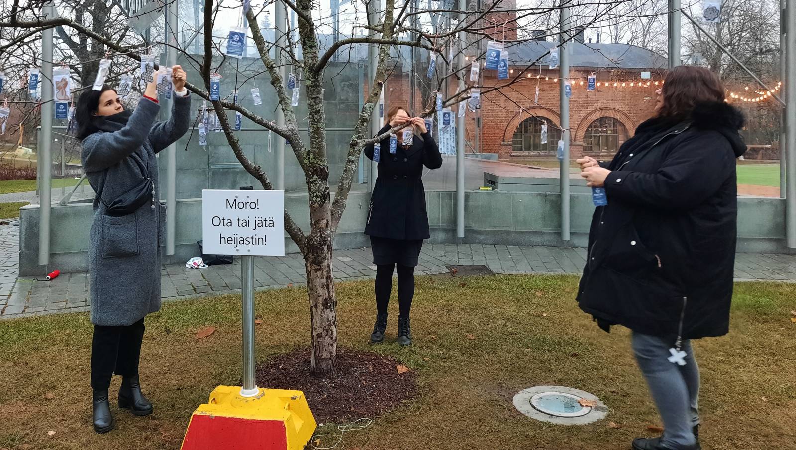 Kuvassa: FabLabin tiimin Taru Arvio, Noora Nyberg ja Hanne Lehtola ripustavat heijastimia ohikulkijoiden mukaan otettaviksi Laikunlavalla.