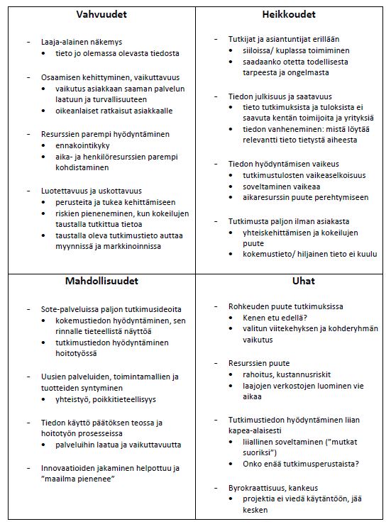 Uhaksi koettiin resurssien puute sekä liiallinen byrokraattisuus ja kankeus, jolloin hyväkin projekti voi jäädä kesken. Tutkimukselta kaivattiin rohkeutta ja uudenlaisia avauksia. Kuitenkin tulevaisuudessa nähtiin mahdollisuuksia mm. siinä, että sote-palveluissa on runsaasti tutkimus- ja kehittämisideoita. Poikkitieteellisen yhteistyön voimaan luotetaan: tämä voi luoda uudenlaisia palveluita, toimintamalleja ja tuotteita. Uskottiin, että tiedon käyttö päätöksenteossa ja hoitotyön prosesseissa parantaa palveluiden laatua ja vaikuttavuutta. Mahdollisuutena nähtiin se, että tulevaisuudessa innovaatioaihioiden jakaminen helpottuu ja ”maailma pienenee”.