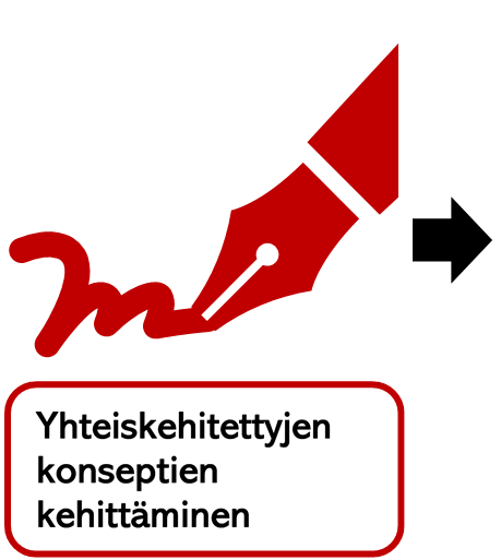 Osana innovaatioekosysteemin rakentamisen kokeilua järjestettiin lukuisia työpajoja ja yhteiskehittämistapahtumia, joissa ideoitiin uusia palveluja kehittämistarpeisiin. Kehittämisen selkärankana toimi palveluinnovaatioprosessin malli. Potentiaalisimpien konspetien kanssa edettiin aina skaalaamisen mahdollisuuksien käytännön testaamiseen saakka. Alla olevia kuvakkeita painamalla löydät hankkeessa tuotetut ideat, aihiot ja konseptit sekä lisätietoja kyseisien vaiheiden sisällöistä kampus sote -hankkeessa.