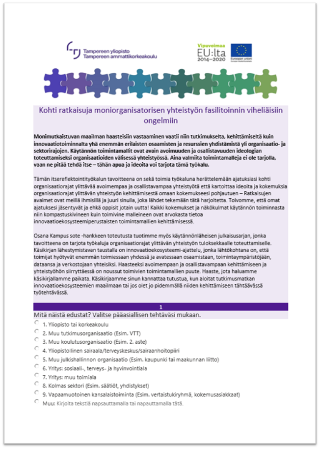 Tällä työkalulla voit käydä läpi ekosysteemikehittämisen keskeisimpiä haasteita ja oppia samalla hiukan teoriaa. Voit kirjoittaa vastaukset vastauskenttiin suoraan wordissa avaamalla tiedoston.