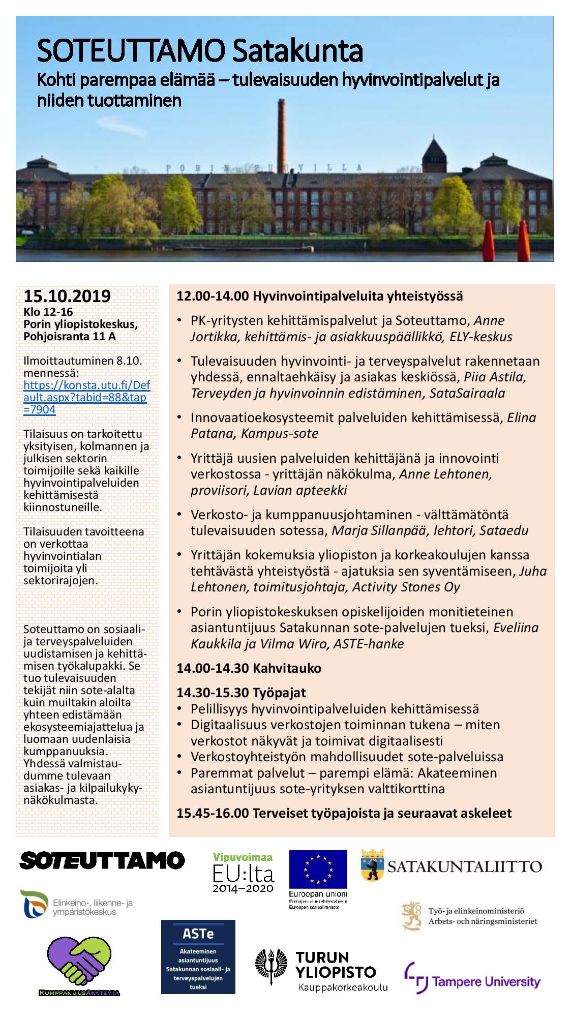 Tampereen yliopiston (SOC) ASTe- ja Kampus-Sote –hankkeet sekä Turun yliopiston kauppakorkeakoulun KumppanuusAkatemia –hanke kutsuvat Sinut ja verkostosi Satakunnan seuraavaan Soteuttamoon 15.10 klo 12.00-16.00 Porin yliopistokeskukseen!