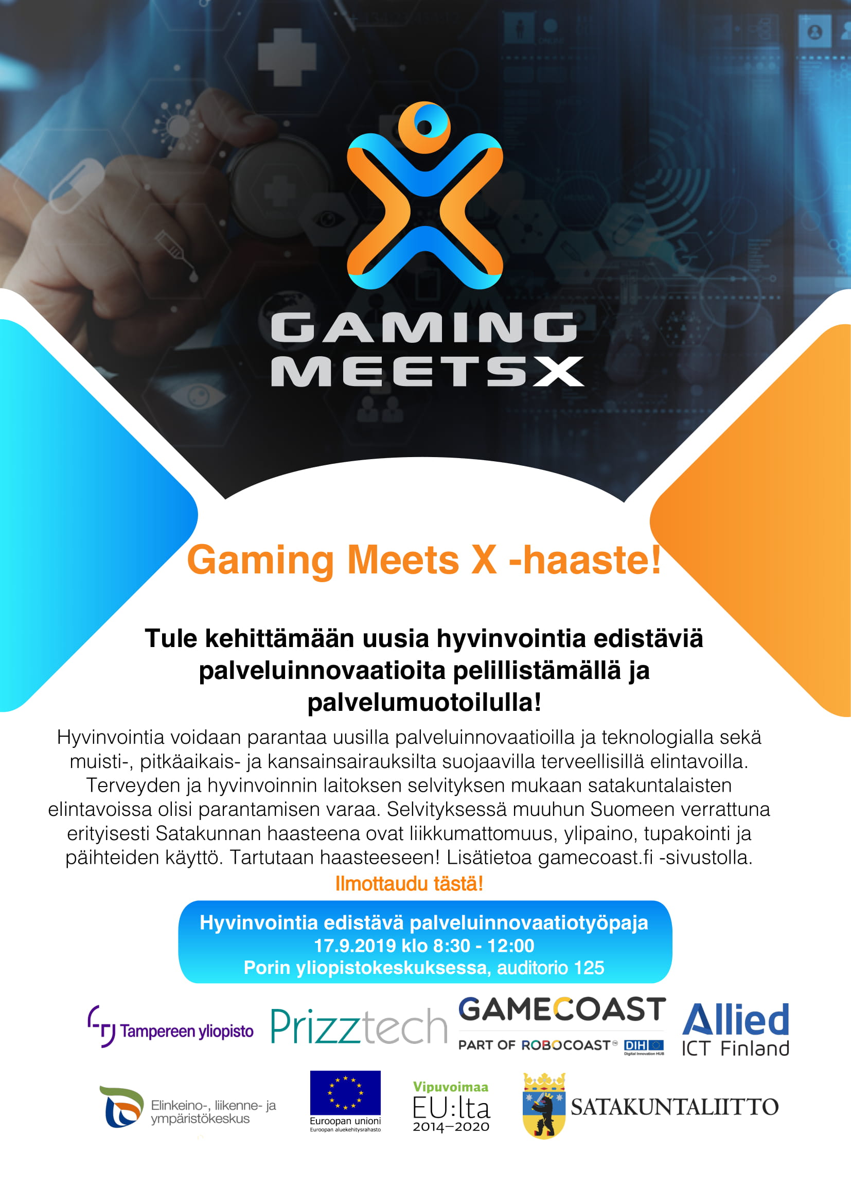 ”Pelillistäminen voidaan nähdä toimintana, joka kohdistuu toiseen toimintatapaan, kuten työhyvinvointiin, työturvallisuuteen tai elämäntapojen parantamiseen. Kun kyseessä on ei-pelillinen palvelu tai tuote, käytetään prosessista nimeä pelillistäminen eli gamification. (Ängesleveä 2014, 9, 19). Pelillistämisen funktiot ovat osallistaminen, motivoiminen, innostaminen ja sitouttaminen. Gaming Meets X -työpajassa edistettiin ryhmätyön yhteiskehittämisen kulttuuria avoimuuden, oppimisen ja inhimillisen vuorovaikutuksen kulttuurina. Työpajan tehtävänä oli tukea tehokasta toimintatapojen ja käytäntöjen uudistamista osallistamalla työpajassa eri toimijat yhteiskehittämiseen. Gaming Meets X -työpajassa toimi BrandCube-työkalu inhimillisen vuorovaikutuksen välineenä ryhmätyöskentelyssä, jossa yhteiskehitettiin uusia Sote-alan palveluinnovaatioita elämätapojen muutosta varten, tehostettiin ja motivoitiin toimintatapoja, joilla voidaan kehittää uusia Sote-alan palveluinnovaatioita pelillistämällä. Gaming Meets X -työpajassa toimi palvelumuotoilun oppeja hyödyntävä BrandCube-prototypointityökalu, joka moniaistillisena kolmiulotteisena paperikuutiona tai niiden sarjana soveltuu konseptiointiin ja fyysisten mallien rakentamiseen. BrandCube on älykkääseen paperiteknologiaan perustuva, fyysinen ja kolmiulotteinen työkalu, jota käytettiin työpajassa elämätapojen parantamiseen. Kuutioita voidaan asettaa vierekkäin, rinnakkain, päällekkäin ja ne voidaan kääntää käytettäväksi molemmin puolin hyödyntäen niin kuution ulko- kuin sisäpintaa. Kehittämistyöpajaan osallistui noin 30 Sote-alan – ja teknologian yritysten avainhenkilöä ja lisäksi työpajassa toimi 4 fasilitaattoria. Tästä syntyi viisi palvelukonseptia elämäntapojen parantamiseen. BrandCube työpajan keskeisenä tuloksena osallistujat saivat käyttöönsä menetelmän, uudenlaisen viestintämuodon ja konkreettisen välineen yhteiskehittämiseen. Työpajan osallistujat sitoutettiin jatkojalostamaan ideoitaan eteenpäin ja he esittivät konseptejaan pitchaamalla 15.10.2019 Soteuttamon hyvinvoinnin pelillistämisen työpajassa asiantuntijoille, rahoittajille ja muille aihealueesta kiinnostuneille.”
