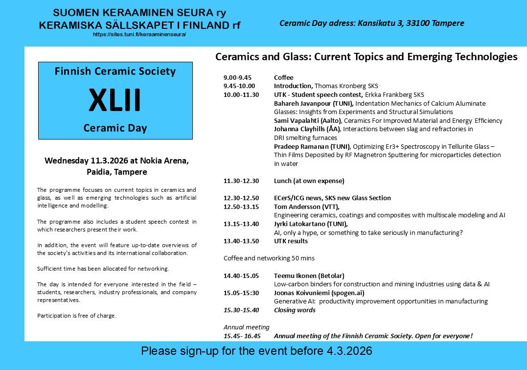 The 42nd Ceramic Day of the Finnish Ceramic Society will be held on Wednesday, March 11, 2026, at Nokia Arena (Paidia Hall) in Tampere. The event is hosted by Tampere University.
