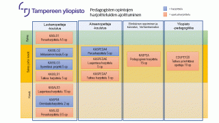 Riveinä on kuvattu lukukausi/kaudet, jolle kyseinen jakso opiskelijan henkilökohtaisessa opetussuunnitelmassa voi sijoittua. Opintojakson värikoodi kertoo harjoittelun luonteen.