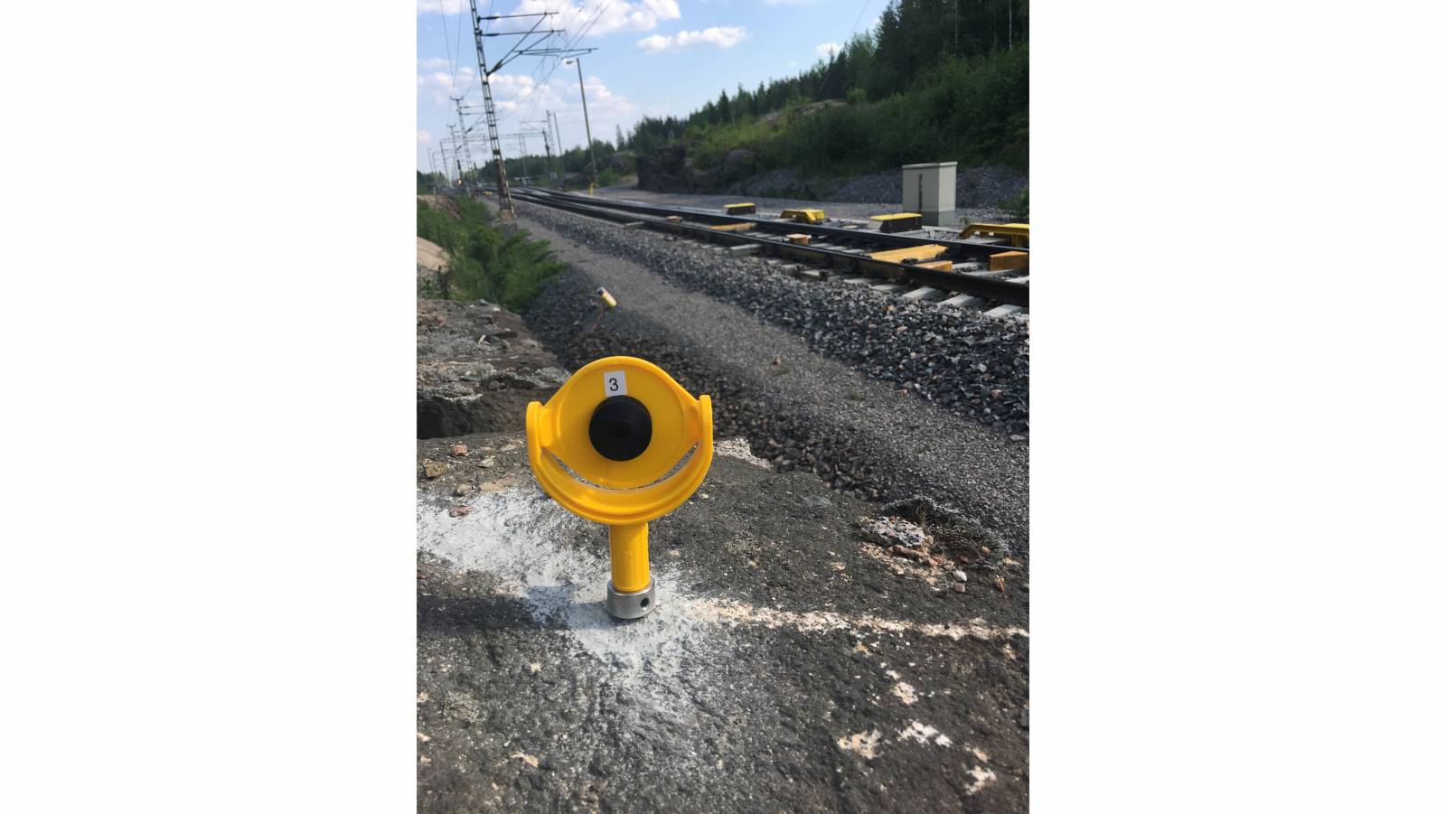Kuvateksti: Prisma, jonka avulla rakennetaan mittapisteverkko, rataa mitattaessa. Asennus kallioon, näin mittaukset saadaan vuodesta toiseen tarkasti.