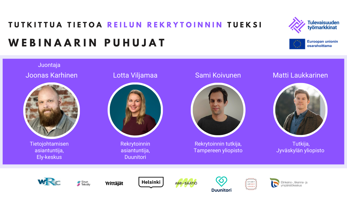 Webinaarin juonsi Joonas Karhinen ja puhujina olivat Duunitorin Lotta Viljamaa sekä Reilu Rekrytointi -hankkeen Matti Laukkarinen ja Sami Koivunen. Karhinen esitteli Ely-keskuksen hanketta ”Tulevaisuuden työmarkkinat” ja Viljamaa Duunitorin tämän vuoden kansallisen rekrytointitutkimuksen tuloksia liittyen sekä suurten työnantajien että työnhakijoiden tekoälyn käyttöön rekrytoinnissa. Sen jälkeen Koivusen paino oli esitellä tekoälyn mahdollisuuksia ja Laukkarisen tekoälyn haasteita rekrytoinnissa. Myös tuoreen tekoälyasetuksen aikataulusta ja käytännön vaikutuksista rekrytointiin oli oma osio.