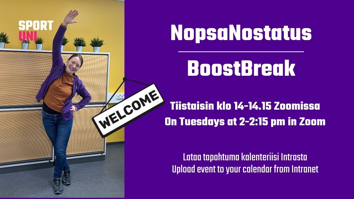 Tampere University community BoostBreak every Tuesdays at 14:00 in Zoom. You can find the link from Tuni intranet or SportUni selection calendar.