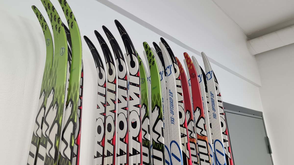 There are several pairs of traditional skis and ski boots and poles for rent in SportUni Kauppi.