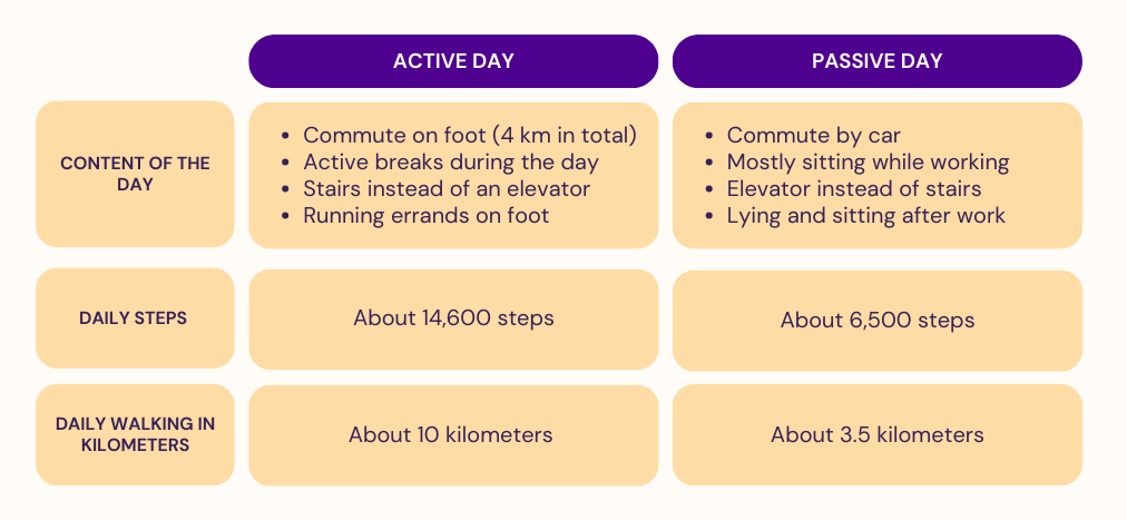 SportUni’s Sport Coordinator, Janette Savumaa, compared two workdays from the perspective of daily activity. On the first day, she chose to make active choices, such as walking for her commutes, taking the stairs instead of the elevator, and taking breaks regularly during the day. On the second day, on the other hand, she aimed to make opposite choices, avoiding everyday physical activity as much as possible. In the table below, you can see the comparison between these active and passive days.