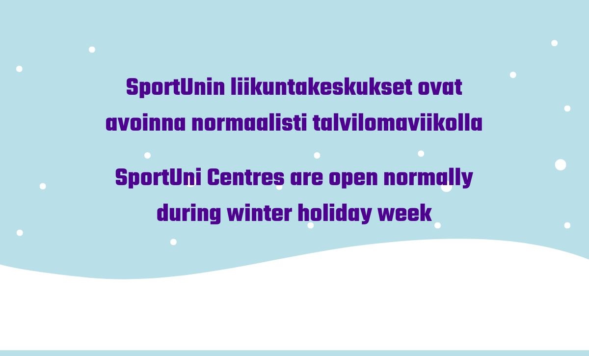 All SportUni Centres are open normally during the winter holiday week 9. Check out daily opening hours on our Sport Centres website.