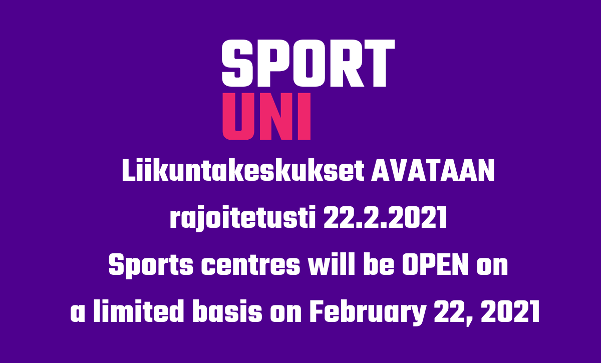 SportUni will open all its sports centres in Kauppi, Hervanta and Atalpa in City Centre, on a limited basis on Monday, February 22, 2021.